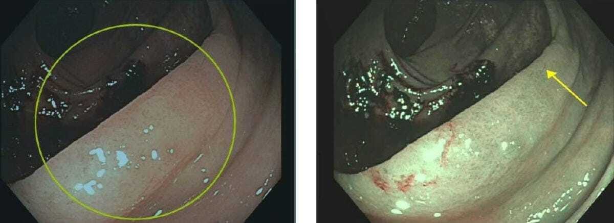 73 yo woman with asthma and anxiety. Colonoscopy is done for chronic diarrhea. Altered mucosal nodularity in the ascending colon was noted on both WL and NBI.