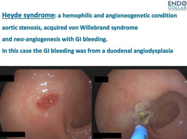 The classic teaching refers to Heyde’s syndrome as “the association of aortic stenosis and cecal angiodysplasias”. Whereas this is partially true, in this newsletter you will learn that Heyde syndrome is a type of hemophilia (acquired von Willebrand disease) leading to GI bleeding from various types of gastrointestinal angiodysplasias.