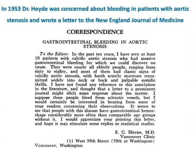 Indeed, Dr. Heyde never specifically mentioned the cecum as the source of bleeding (1). He observed that patients with aortic stenosis had cryptogenic bleeding, speculating that it might originate in “sclerotic vessels”. His astute observations, manifested in simple letter to a medical journal (Figure 2, reference No.1), opened a pandora’s box trying to elucidate the association of aortic stenosis and gastrointestinal bleeding.