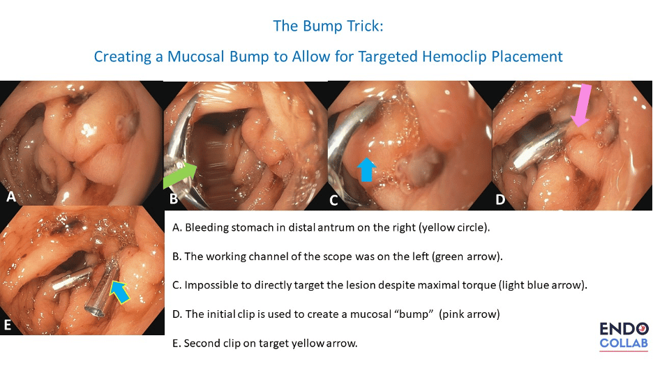 Five, as in this case, use the "bump trick". The initial clip is used to create a mucosal “bump” (pink arrow). The second (or hemostatic) clip can now be better targeted to the lesion, as the bump has lifted some folds (D, pink arrow) on the left side and allows for better capture of the ulcer on the right E, light blue arrow).