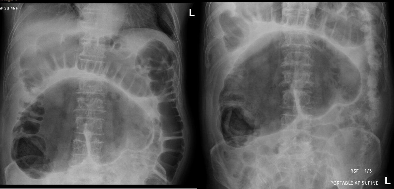 Cecal volvulus occurs because of the cecum twisting around its mesentery, often leading to a bowel obstruction (1). If unrecognized and untreated cecal volvulus can lead to bowel perforation and fecal peritonitis (1). Cecal volvulus accounts for roughly 10% of volvulus cases and typically occurs in younger patients compared to sigmoid volvulus (1). Patients with a developmental failure of peritoneal fixation of the proximal colon and restriction of bowel movement at fixed point from prior adhesions, mass, or scarring are risk factors for development of cecal volvulus (1). On KUB you will typically see marked distention of a loop of large bowel extending from the RLQ to the epigastric area or LUQ which can resemble a coffee bean, as seen above in figures A/B. A contrast enema or abdominal CT scan can be done for further characterization. Treatment options depend on the presence of colonic ischemia and tissue viability (1). In cases where the cecum is not viable a right hemicolectomy is indicated (1). In cases where there is no tissue ischemia treatment involves laparoscopic reduction or colonoscope reduction for patients that cannot tolerate surgery (1). However reduction alone is associated with a high risk of recurrence so cecopexy which involves attaching the cecum to the bowel wall is recommended (1).