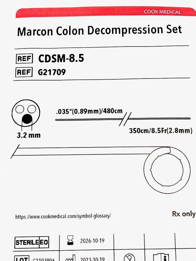 Colon decompression tubes are used for other conditions such as Ogilvie’s syndrome and megacolons. In this case we used a Marcon colon decompression set (see below, Figures 2 and 3). This tube-set is particularly practical and useful as it comes with a wire and the tube has a pigtail end. This pigtail configuration prevents damage to the mucosa or colon perforation once the tube has been placed and is left inside. In addition, the tube has many side holes that allow for passage of liquid stool and air (Fig. 1 and 3D).