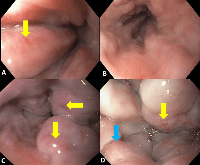 A 58-year-old patient with cirrhosis (Child-Puch B, MELD 20) presented for EGD for screening esophageal varices. He was found to have large esophageal varices with red spots or markings (Figure 1 A) and four columns of varices (Figure 1B). Figures 1C and 1D show additional examples of red markings or spots (yellow arrows). These red spots are areas of wall thinning that may rupture and result in hemorrhage. The light blue arrow on Figure 1D shows a red marking, but here it is also possible to see some “bumps” or surface irregularity suggestive of significant wall thinning.