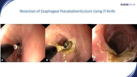 Figure 2. Endoscopic resection of pseudo-diverticulum using an IT-Nano knife. A. Approaching the stenosis and pseudodiverticulum with the IT-Nanoknife. B. Incision of the fibrotic hemi-ring. C. Successful resection of the pseudodiverticulum. Notice the increased esophageal lumen, which allowed for passage of the scope.