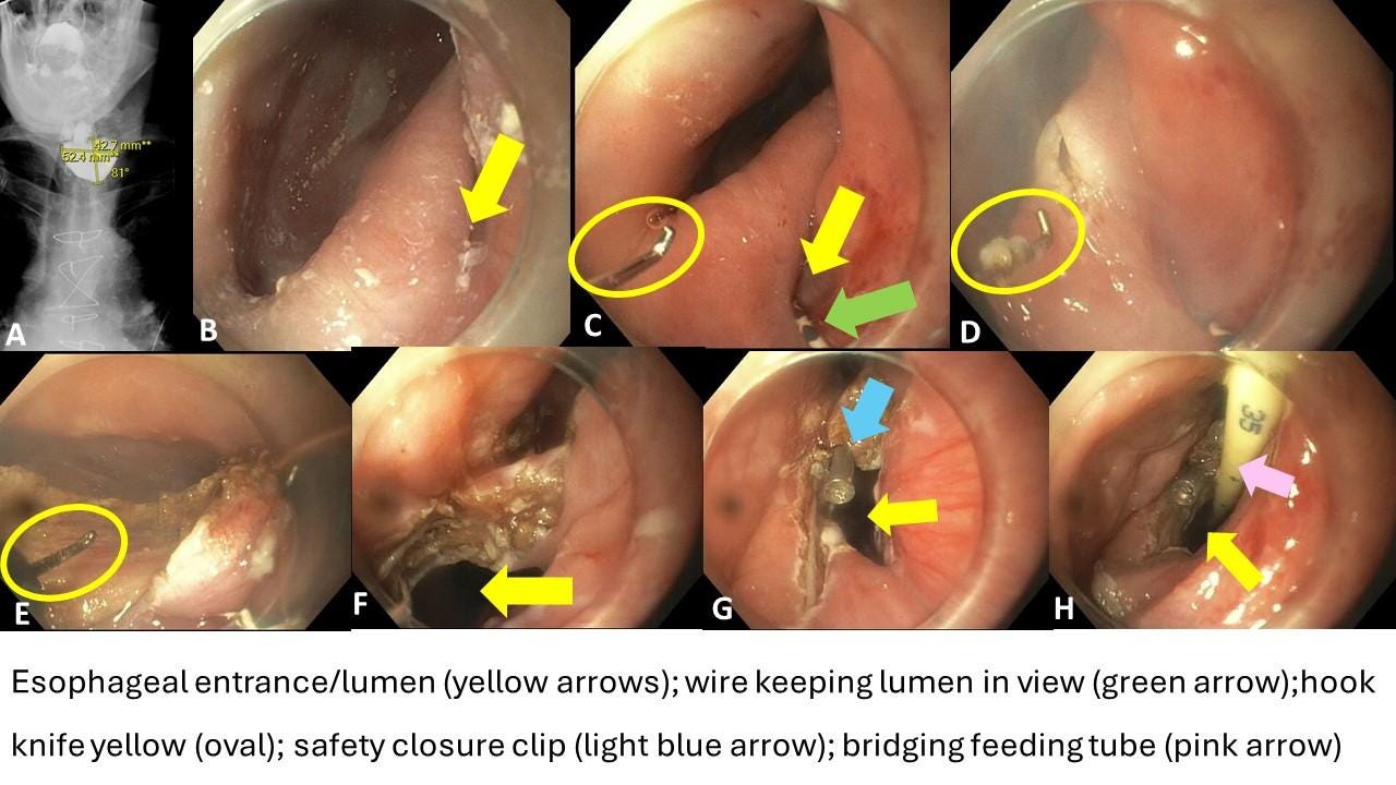 2.) Luminal vison: generally, the esophageal lumen and the diverticulum are clearly visible and distinct. However, more often than not, the septum is quite thick, and the esophageal lumen is barely visible (Figure 1). In this situation we like to place a wire (e.g. biliary guidewire) or a thin tube (e.g. Dobhoff or jejunal feeding tube) into the stomach, to maintain visibility of the esophagus and thus allow for controlled incision and dissection of the septum (Figure 2 and 4, panel D).