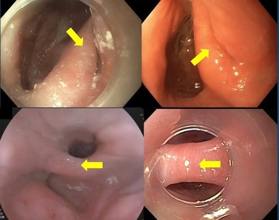 Figure 1. Spectrum of Zenker’s diverticulum. The yellow arrow points to the septum. Note that in some cases it is difficult to see the esophageal lumen, which appears as a “slid” (both upper photos).