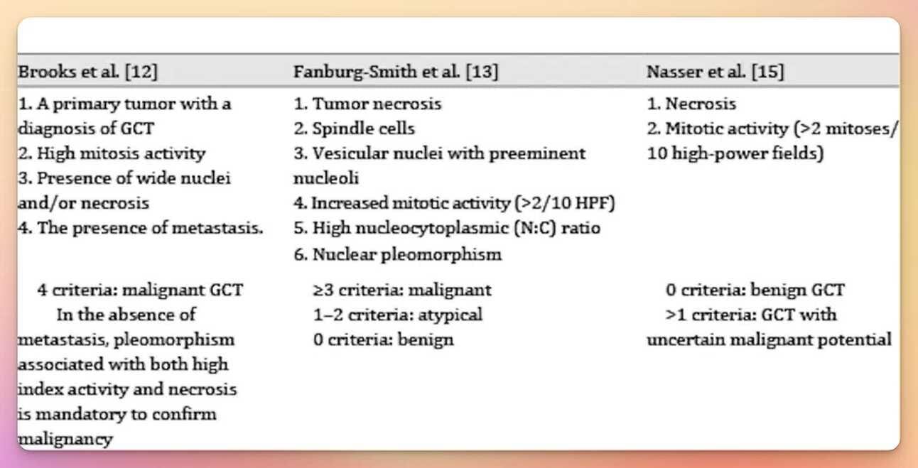 Let's not forget that GCT can be malignant from the outset, regardless of their size or presence of symptoms. Indeed, GCT are classified as malignant, benign and indeterminate. Furthermore, 2% of benign GCT progress to malignancy.