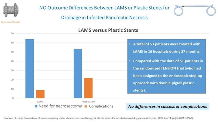 On: Boxhoorn L, et al. Comparison of lumen-apposing metal stents versus double-pigtail plastic stents for infected necrotising pancreatitis. Gut. 2022 Jun 14:gutjnl-2021-325632. doi: 10.1136/gutjnl-2021-325632. Epub ahead of print.