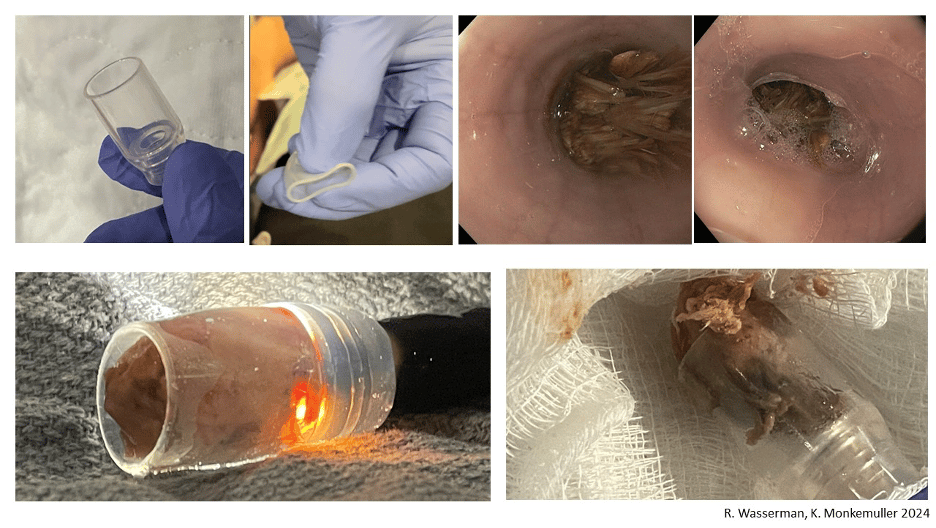 Regarding preferred endoscopic technique, there are lots of utensils in the "toolbox", including distal transparent caps, snares, baskets, and tripod forceps. I like using the distal transparent caps, as they usually allow for suctioning the proximal part of the meat inside, and then it is removed by slowly pulling the scope back out of the esophagus. However, all methods mentioned above work pretty well. One utensil that I have also found quite practical for large or complex meat impactions is the overtube, which allows for repetitive endoscopic intubations, going back-and-forth, removing piece by piece of larger pieces of meat or food.