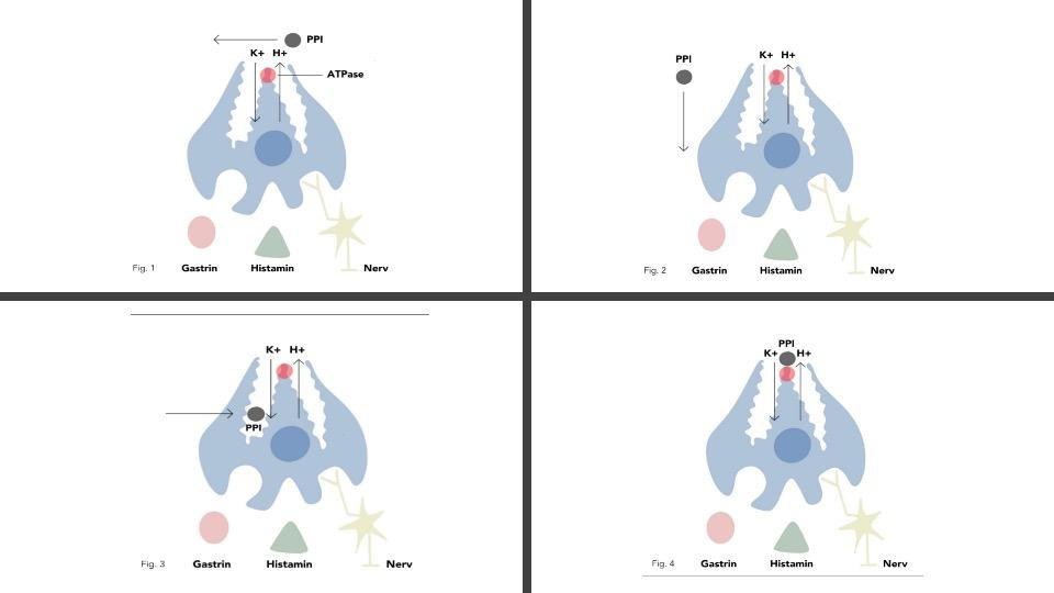 Proton pump inhibitors (PPI=are the most common medications utilized to treat upper gastrointestinal bleeding resulting from acid-peptic disorders and ingestion of non-steroidal anti-inflammatory agents (NSAIDs). The aim of this mini review is to explain the mechanism of action in a practical manner. The following figures show the PPI on the parietal cell of the stomach in a simplified manner. The task of the proton pump is primarily to secrete hydrochloric acid from the parietal cells of the gastric mucosa, in conjunction with food intake as a stimulus. The H+K+ATPase is responsible for this active transport, i.e. proton exchange H+ from the cell for potassium ions K+ into the cell (Figures 1-4).