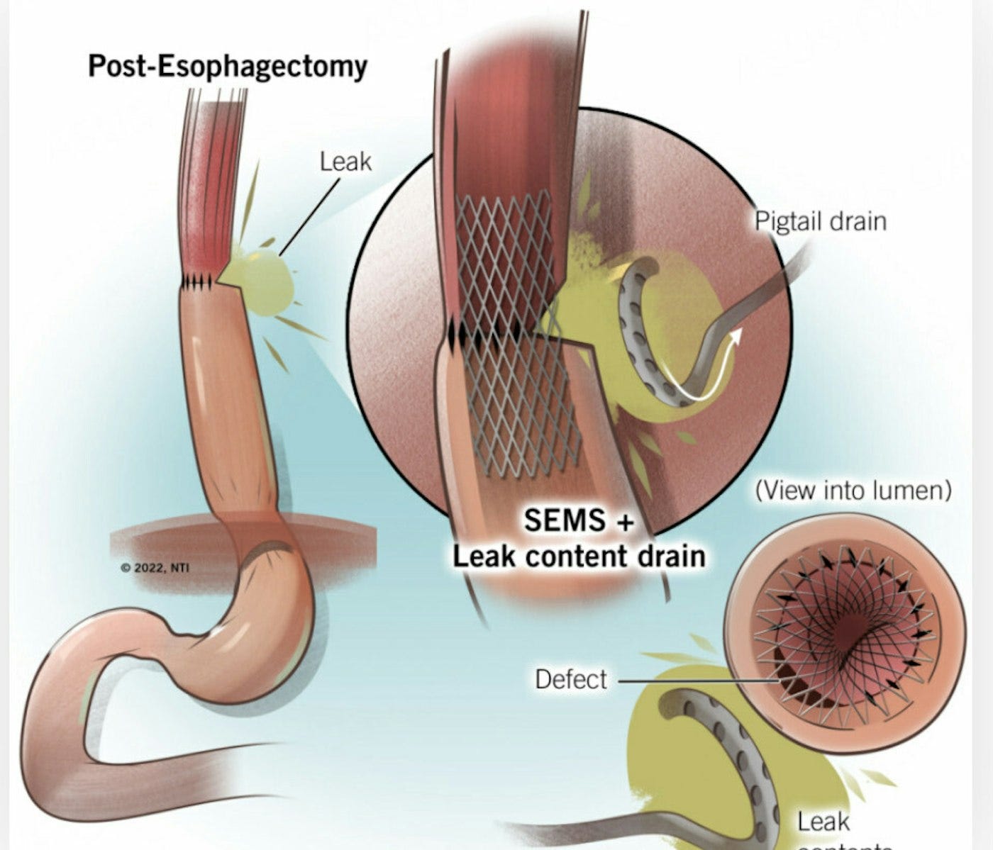 Illustration of a self-expandable metallic stent (SEMS) used for the endoscopic management of esophageal anastomotic leaks