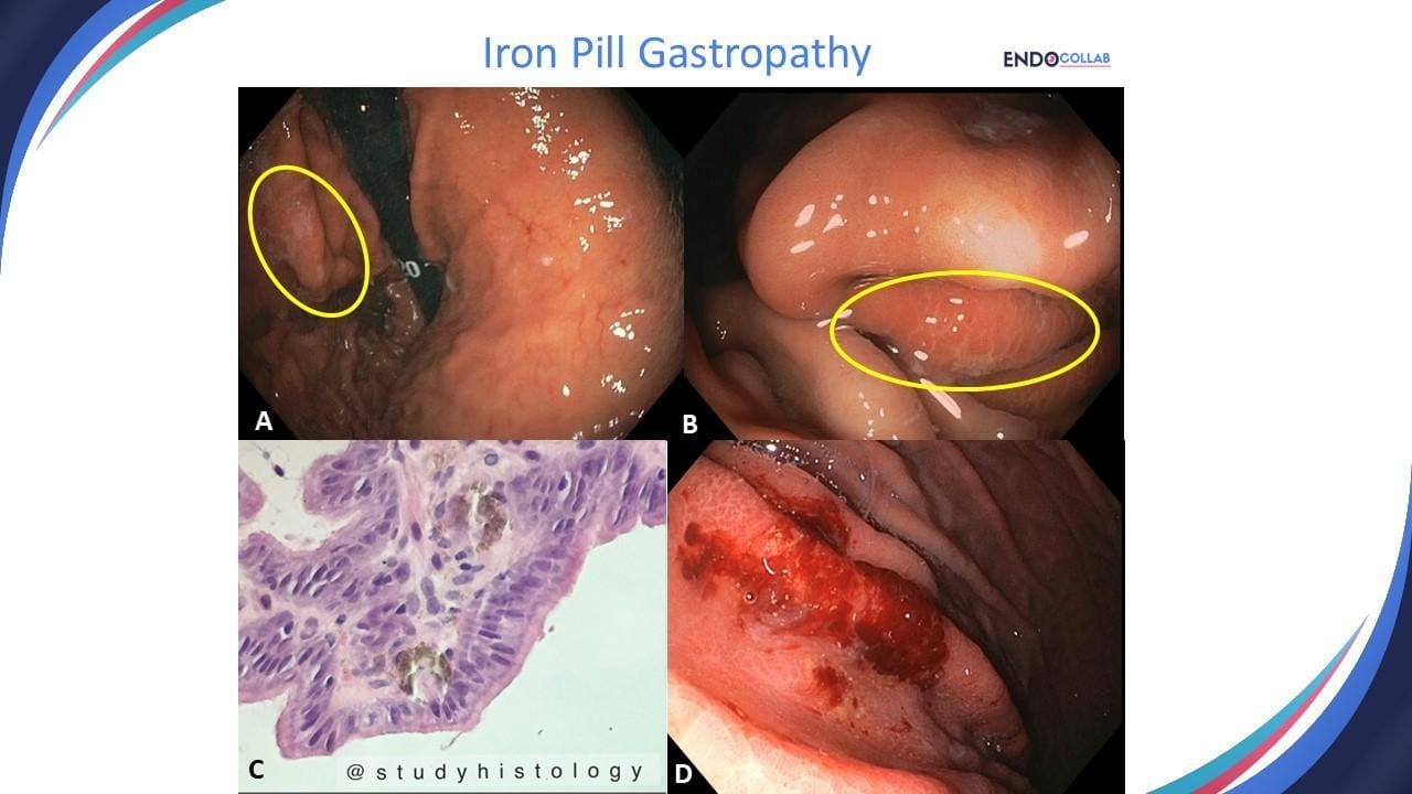 In sum, iron-pill gastritis or gastropathy is a frequently overlooked and missed diagnosis. Whenever you see a focally enlarged and erythematous gastric fold located in the greater curvature of the proximal stomach, often with tiny blood clots, or active blood oozing, think of iron pill gastritis. However, iron pill gastritis may occur in any part of the stomach and present as gastritis, multiple gastric erosions, and ulcers.