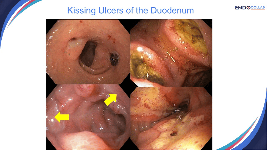 The term “kissing ulcers” of the duodenum describes the presence of two different ulcers facing each other, usually one located anteriorly and the other posteriorly. It appears that the original description was in the surgical literature by Stabile et al in 1979 (Arch Surg). The photo shows a spectrum of kissing ulcers. Occasionally, these may be hard to see (Panel C, yellow arrows).