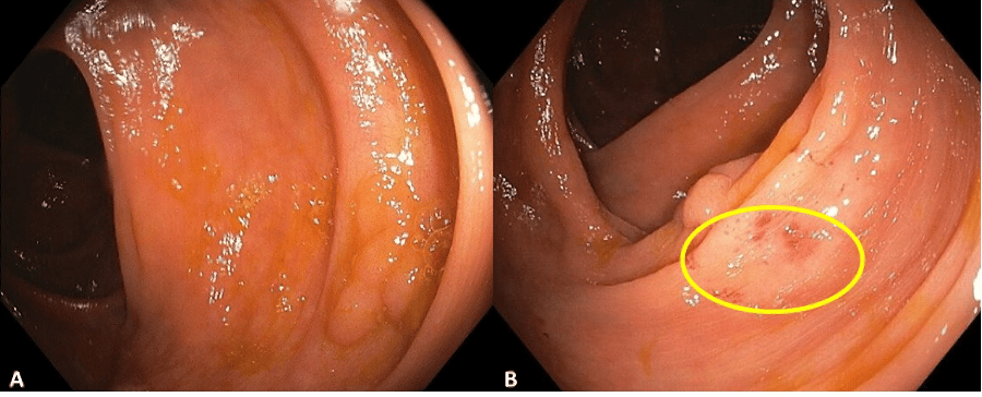 A useful trick is to focus on the lesion, push the scope towards it and suction the mucosa right next it. This creates a red submucosal suction mark, which then becomes pivotal to re-identify or relocate the polyp.