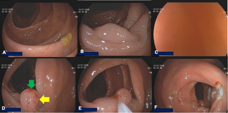 c) Execution (resection): What began as a flat lesion now morphed into a pseudo-polyp or “sessile” lesion and is marked (Fig 2D). If for some reason we lose scope position, the polyp is already marked and easy to find. If scope position was not lost, we proceed to immediate resection (cold or hot) (Fig. 2E and 2F).