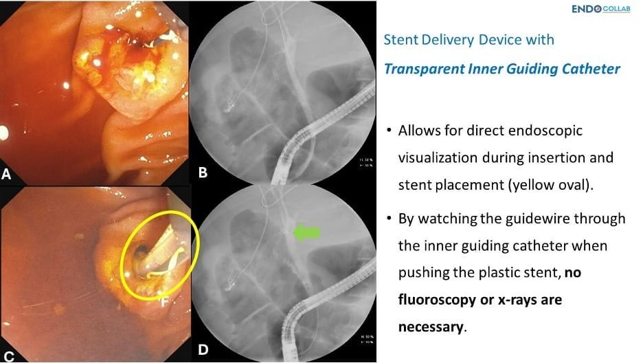 The plastic Stent delivery device with transparent inner guiding catheter (Figure 1, Figure 2) is a nice innovation in ERCP. The simple idea of making a transparent inner guiding catheter, which goes over the biliary guidewire is quite ingenious, as it allows for direct endoscopic visualization during insertion and stent placement (Figure 1E and Figure 2Cyellow oval). By watching the guidewire through the inner guiding catheter when pushing the plastic stent, no fluoroscopy or x-rays are necessary.