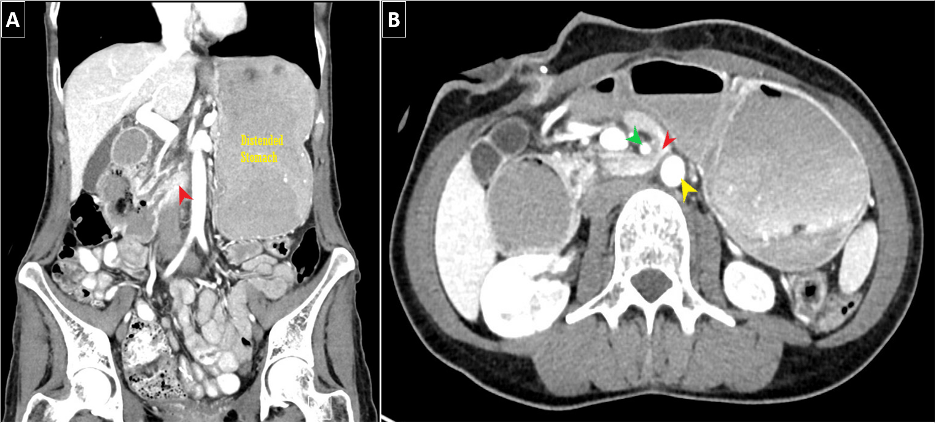 In terms of clinical presentation, signs/symptoms of SMAS are often vague and/or non-specific and can be either acute or chronic. Symptoms can include nausea, vomiting, epi-gastric pain, abdominal distention, weight loss, early satiety, post-prandial discomfort. Of note, both the epigastric pain and post-prandial discomfort are likely to be position dependent where-in a supine position aggravates these symptoms while a left lateral decubitus position alleviates these symptoms. SMAS can have an acute or chronic presentation, presenting with obstructive features including nausea/vomiting, poor oral intake, gastric dilation, and weight loss. Since SMAS is highly variable in its presentation, it can easily be overlooked often leading to delays in diagnosis with potentially fatal complications. A high index of clinical suspicion is needed to ensure proper identification/diagnosis (1-4). Gastrointestinal mucosal injury/damage has been reported as a common complication with a reported rate of 25-59%, often secondary to several mechanisms (e.g., retained or refluxed peptic and/or bile acid, increased intraluminal pressure) (1,3). If not treated in a proper timeframe or manner, this may lead to sequalae such as pneumoperitoneum, emphysema, portal venous gas, or necrosis. Less dire complications such as elevations in pancreatic enzymes and/or acute pancreatitis can also occur (1).