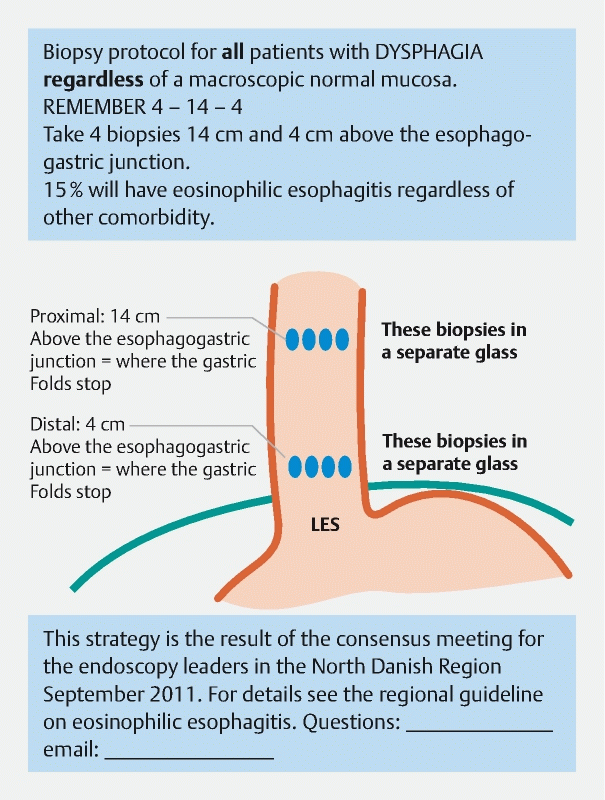 In 2011, leaders of regional endoscopy units attended a consensus meeting where a biopsy protocol was proposed to take eight biopsy samples in dysphagia patients (four biopsies from 4 cm and 14 cm above the esophagogastric junction–“4–14–4 rule”) regardless of the macroscopic appearance. A pictogram showing the 4–14–4 rule was sent to all endoscopy units.