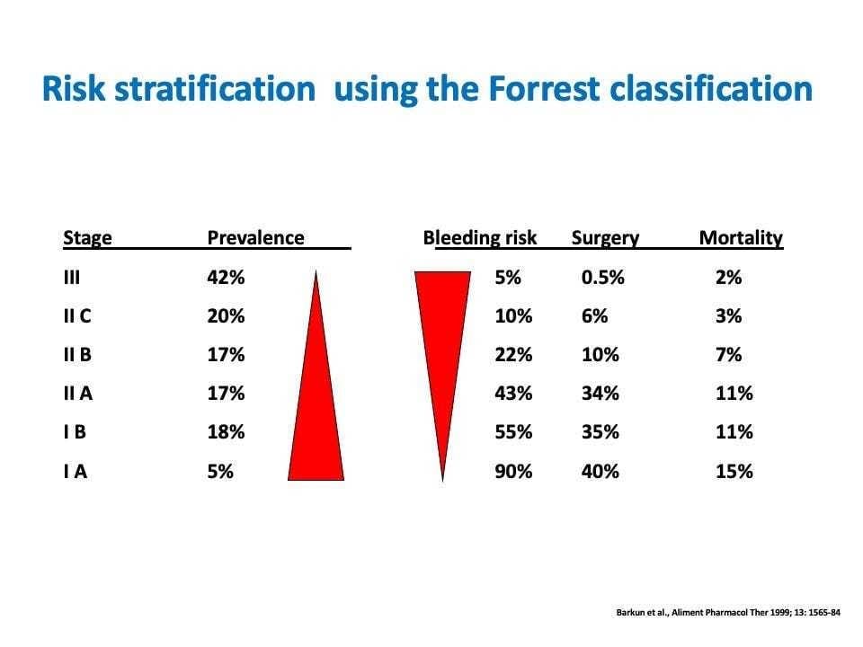 The Forrest classification stratifies lesions based on endoscopic characteristics and correlated risk of recurrent bleeding if not treated (Figure 1). For example, a spurting arterial bleed (Forrest Ia) carries a 90-100% risk of continued hemorrhage, while an ulcer with a pigmented flat spot (Forrest IIc) has only a 10-20% rebleeding risk (2,3). This provides valuable prognostic information to triage lesions requiring urgent therapy.