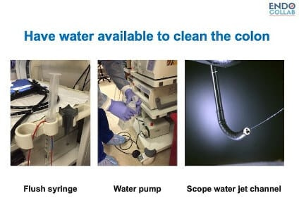 Furthermore, using lots of water during colonoscopy is essential to clean the mucosal surface and remove debris to improve detection of colorectal adenomas. Lastly, we want to emphasize that water is also is advantageous to perform some resections (“underwater endoscopic mucosal resection”) and is essential to clean the wound surface during and after polypectomy.